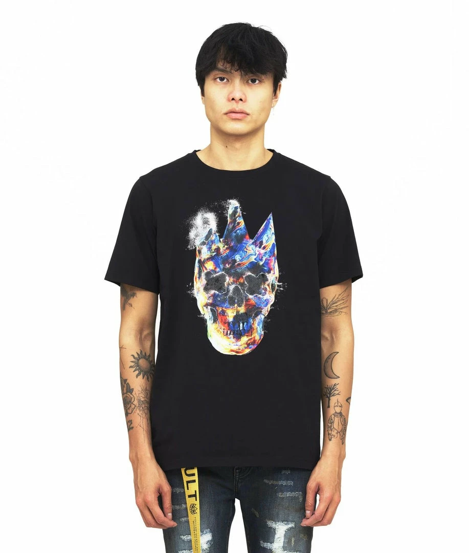 Cotton black logo t shirt is adorned with a large Cult printed graphic on the front.
