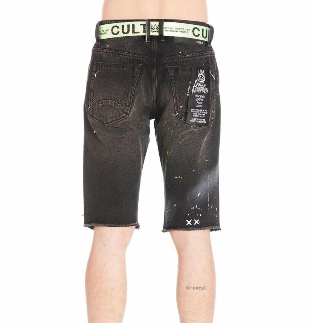 Slim-style shorts with a relaxed waist and a low rise. This black rocker slim short is crafted from a premium denim neon paint splatter and a vintage wash to create a unique denim color combination. The leg narrows from the knee to the ankle. neon green utility belt included.