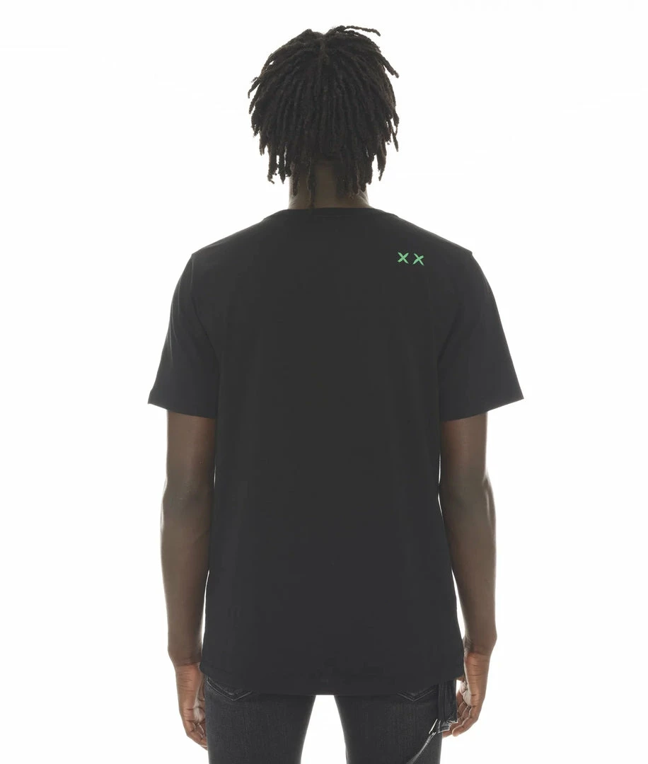 Cotton vintage black t-shirt is adorned with a large Cult printed graphic on the front and printed “XX” on the back right shoulder.