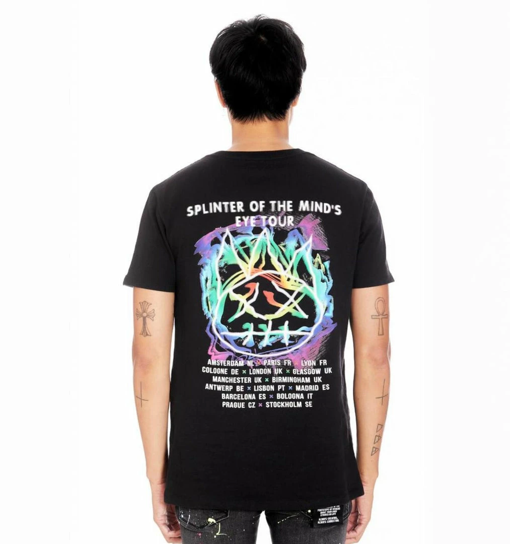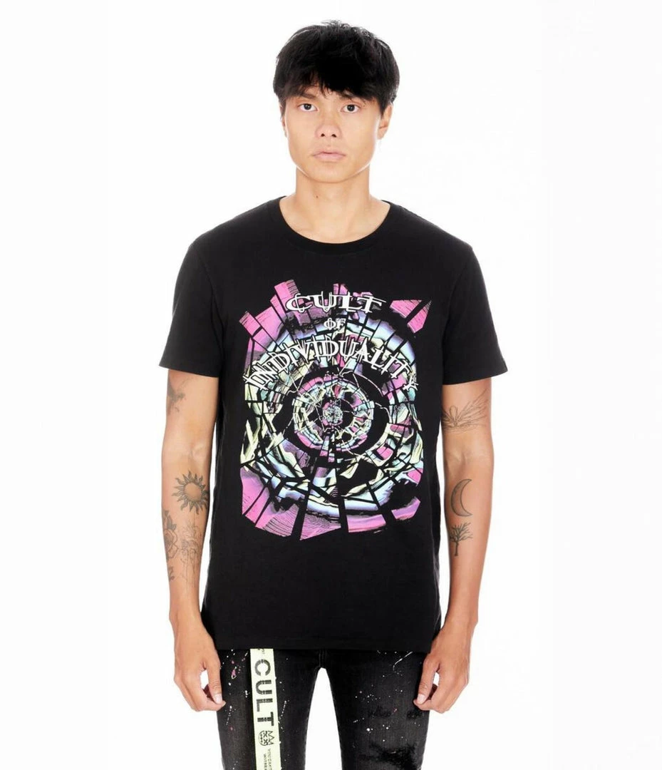 Cotton black logo t-shirt is adorned with a large Cult printed graphic on the front and back.