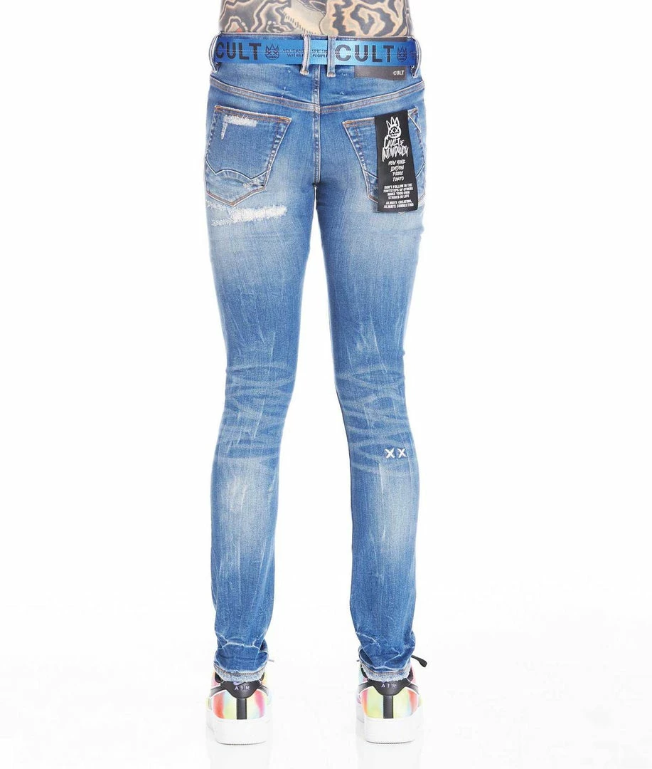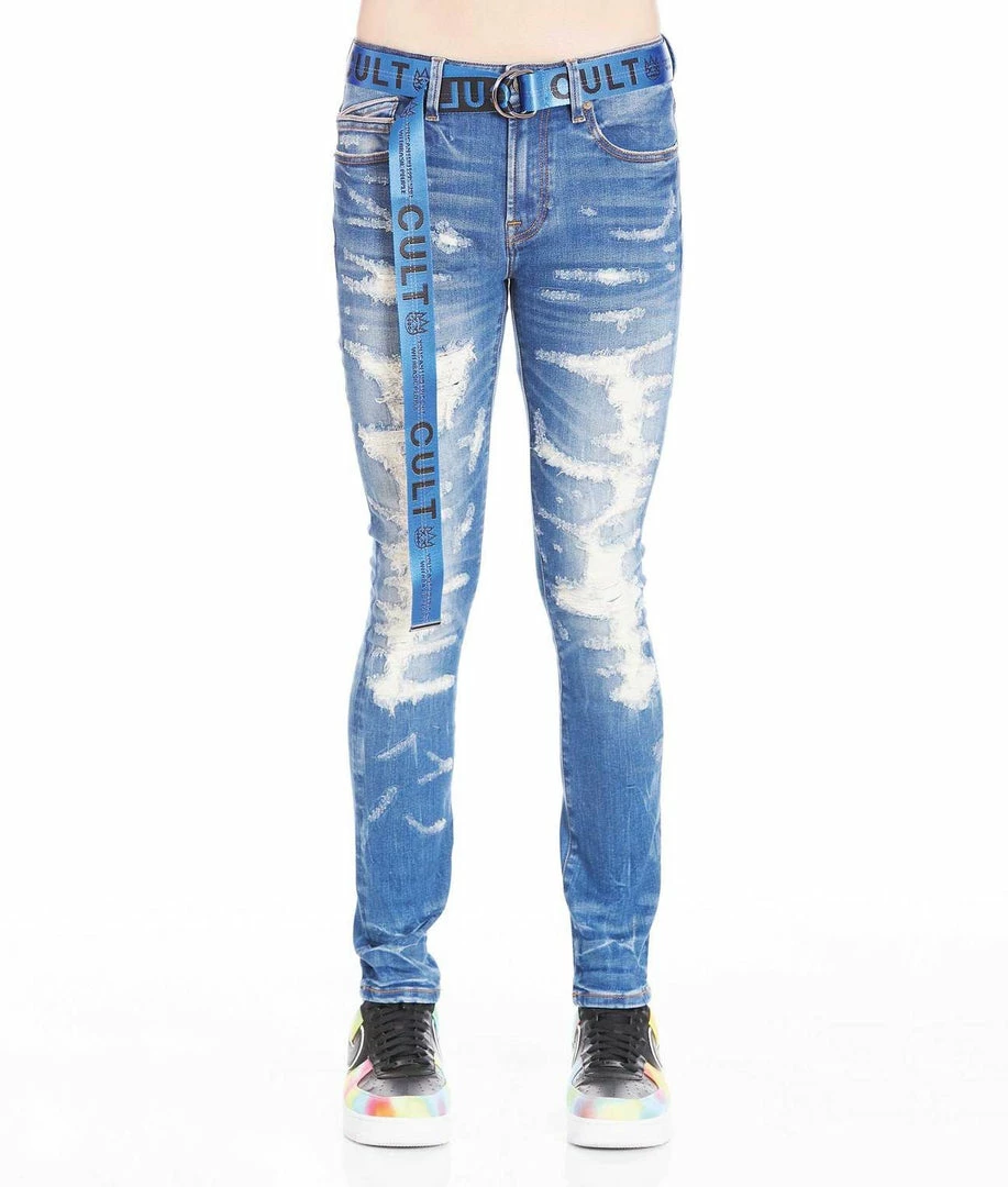 This medium blue stretch punk super skinny style has a narrow leg from thigh to ankle. Crafted from premium stretch denim then vintage washed with rips and repairs for a clean design. It features the cult signature selvedge trim details and XX” embriodery on the back leg and a royal blue utility belt included.