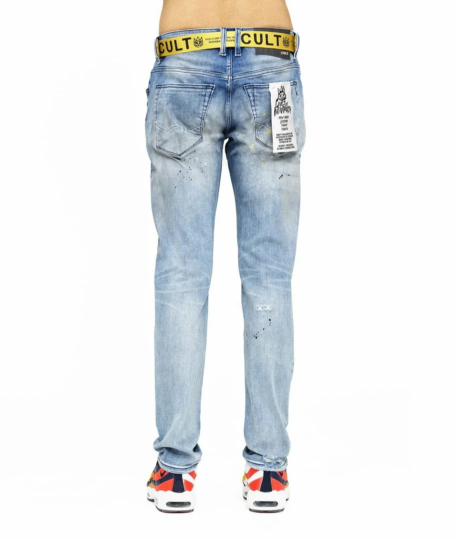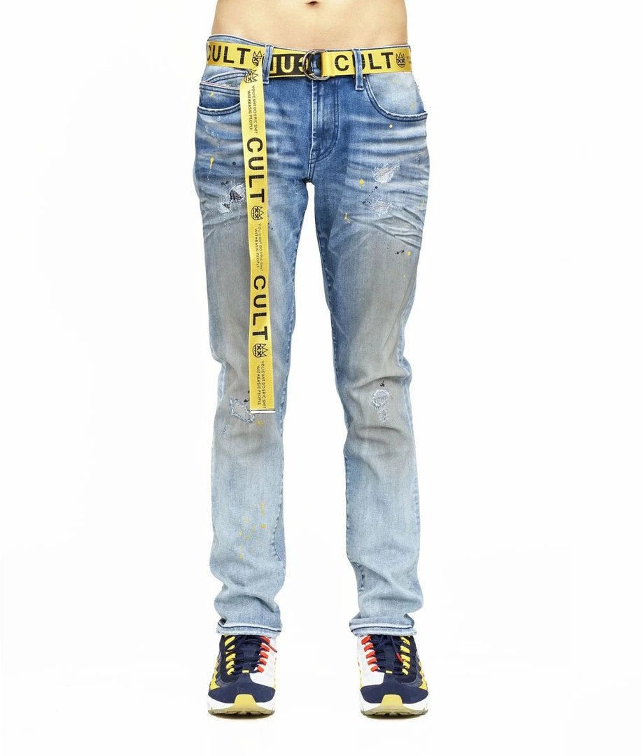 This light blue stretch rocker slim style has a narrow leg from thigh to ankle. Crafted from a premium stretch denim then vintage washed with yellow paint splatters for a clean design. It features the cult signature selvedge trim details and XX” embroidery on the back leg and comes with a utility belt.