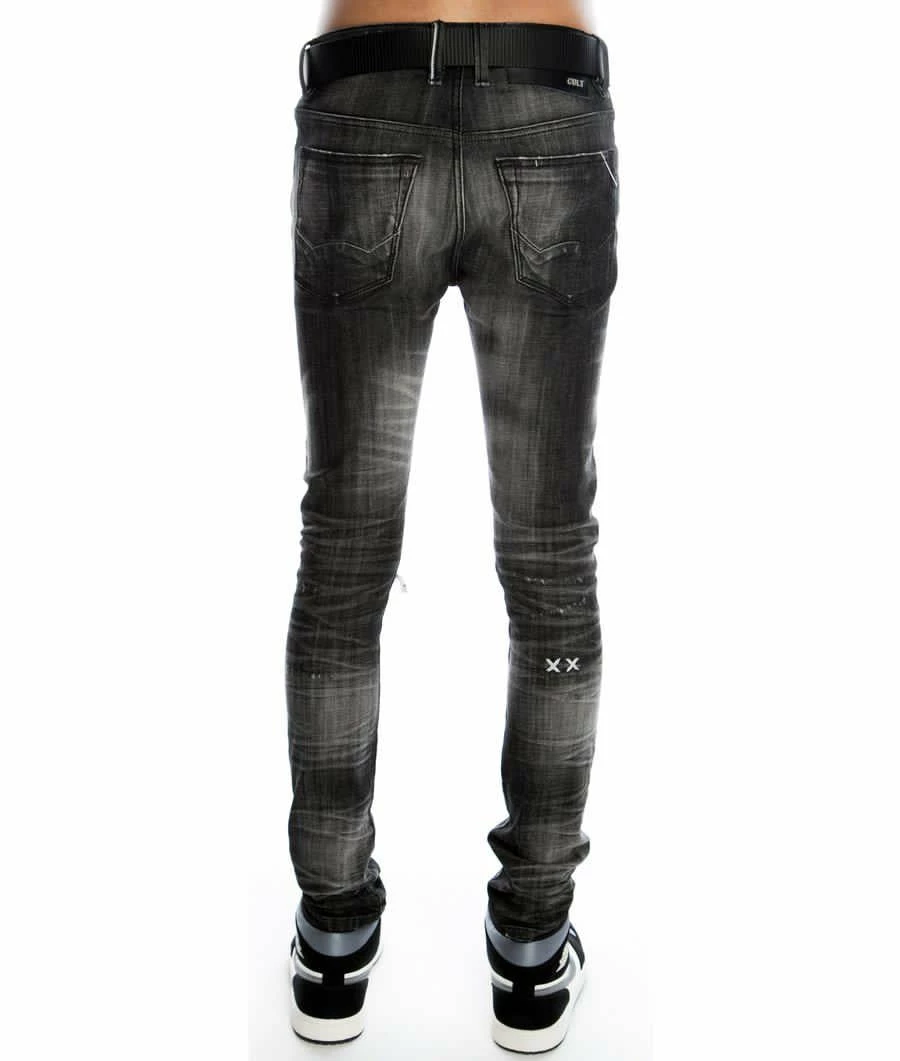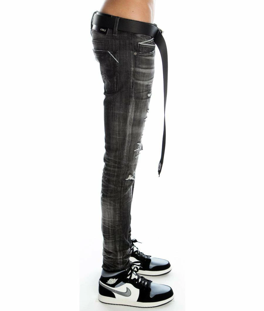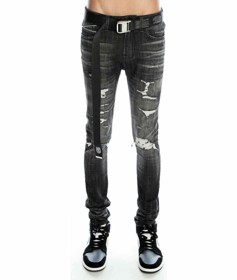 This black punk super skinny style has a narrow leg from thigh to ankle. Crafted from a premium stretch denim then vintage washed with rips and repairs for a clean design with the utility belt included.