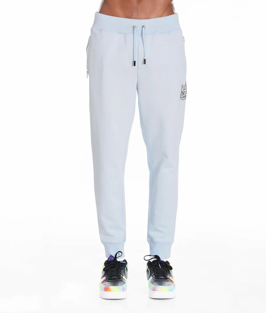 These sky sweatpants are cut from heavyweight french terry. With a small printed logo on the front in a raised popcorn applique for a great combination.