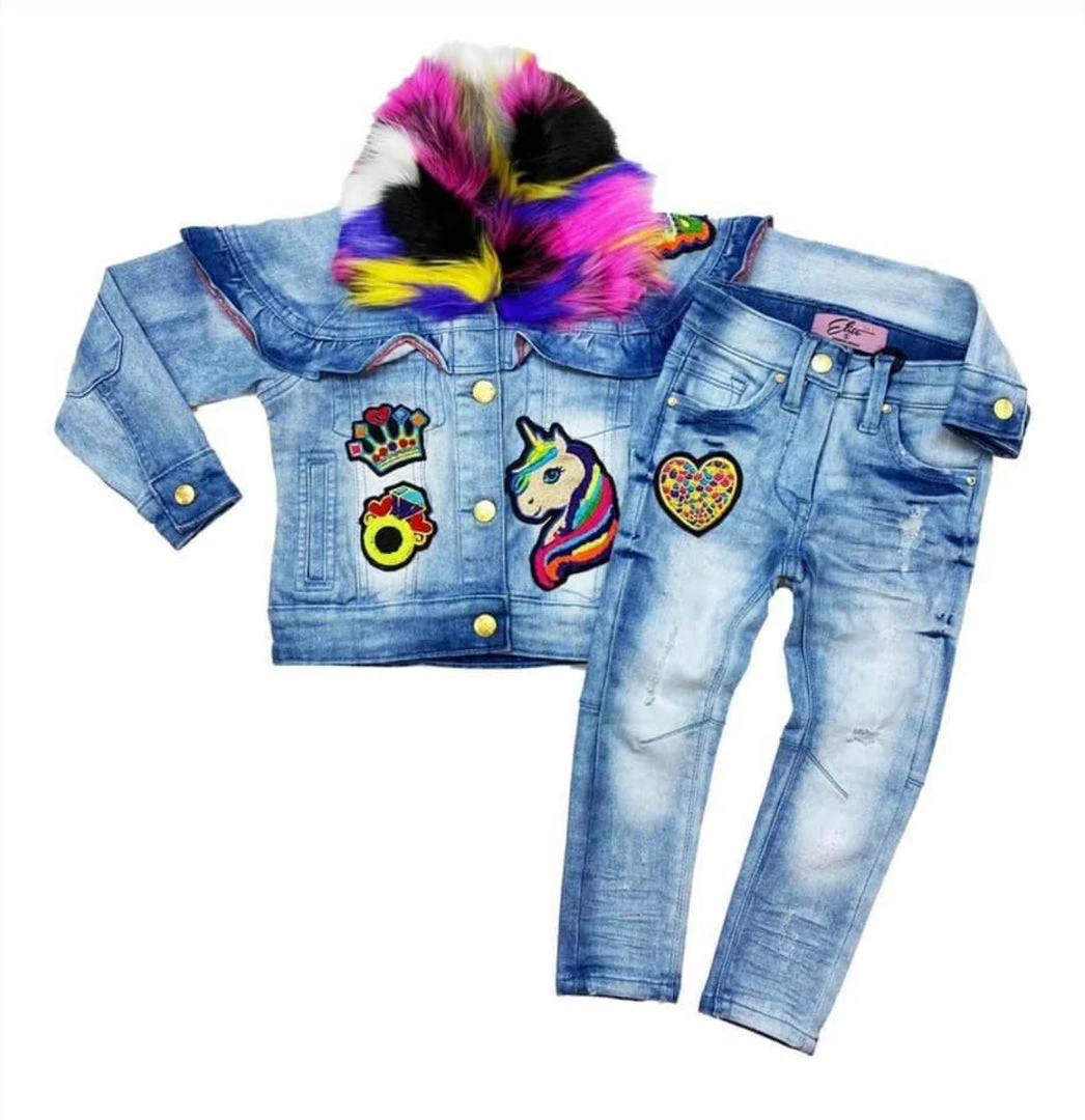 Elite denim (kids girls light blue “rainbow furry denim set)Â