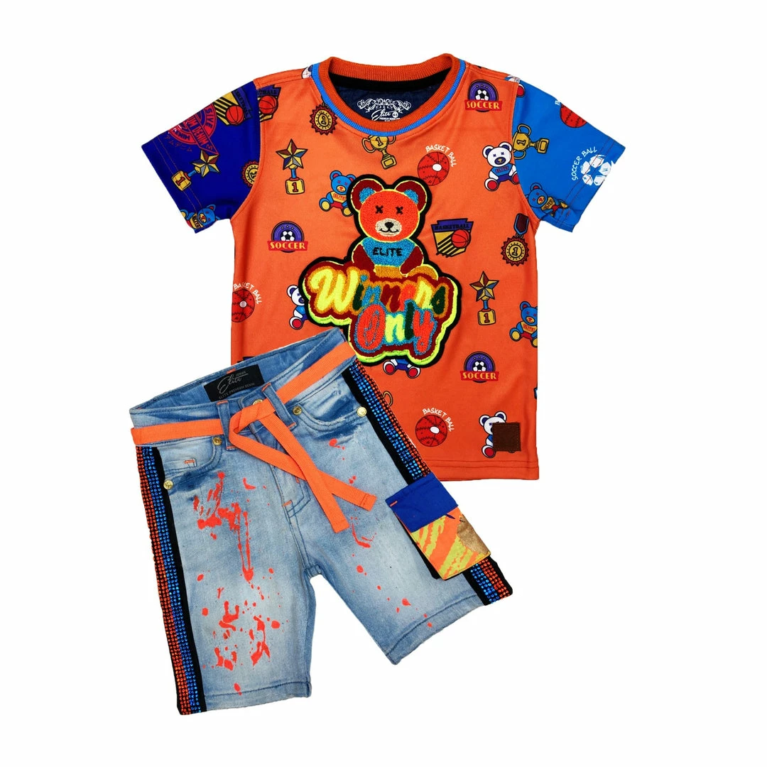 Elite denim (kids orange/baby blue “winner short set) True fitted