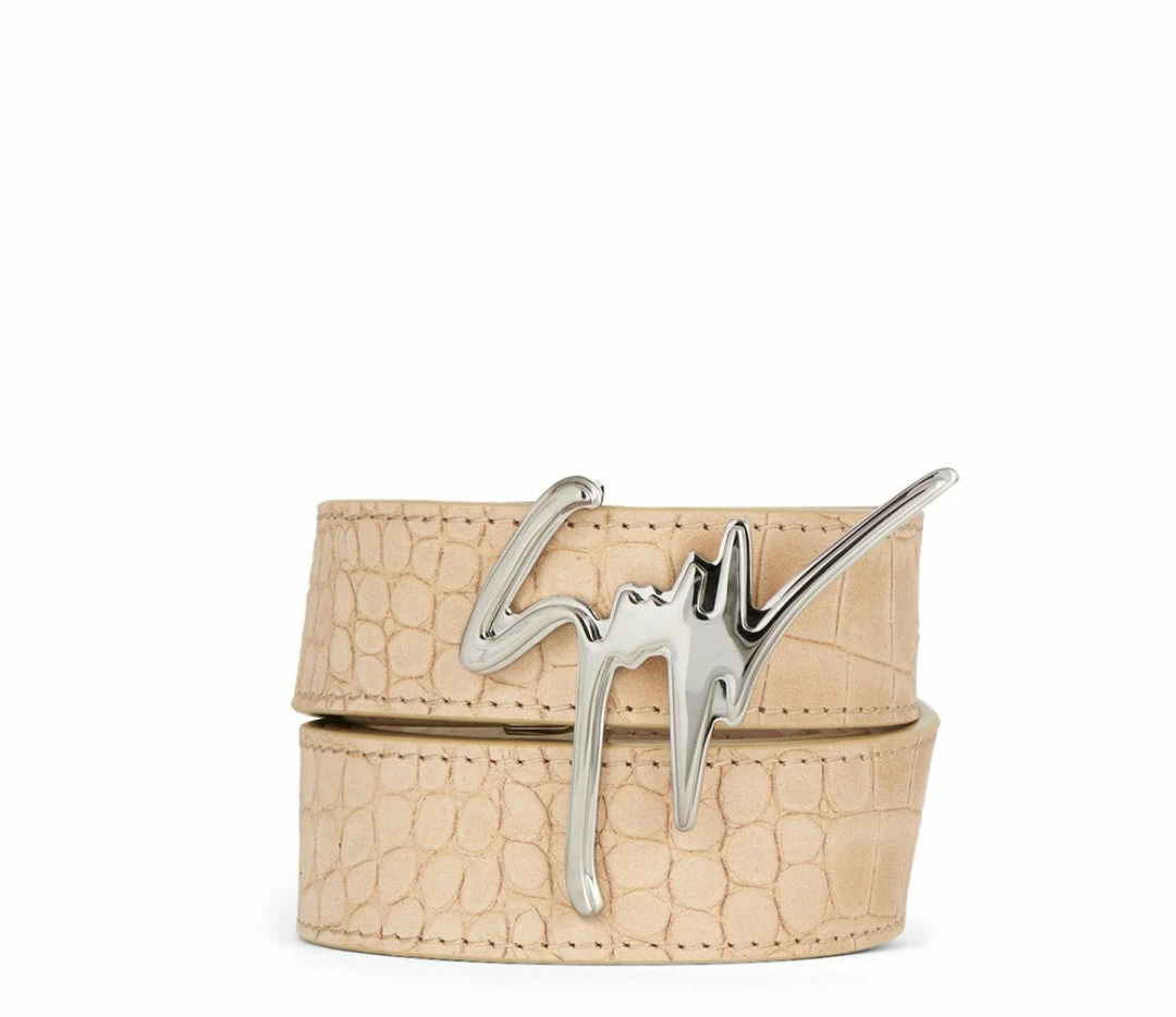 Beige nubuck leather belt. Customised with a metal Signature buckle used to fasten it.