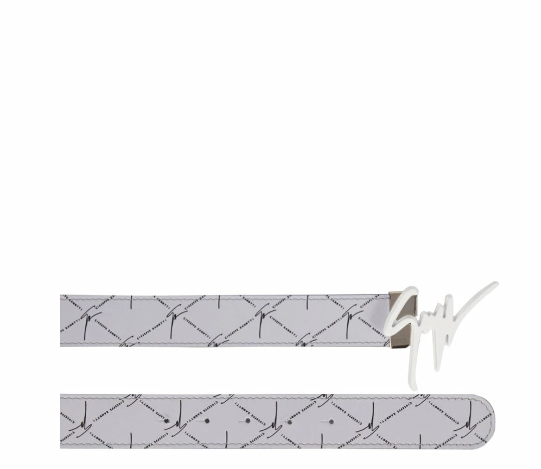 White leather belt customised with special logo all over. Fastens with tone-on-tone rubber Signature buckle.