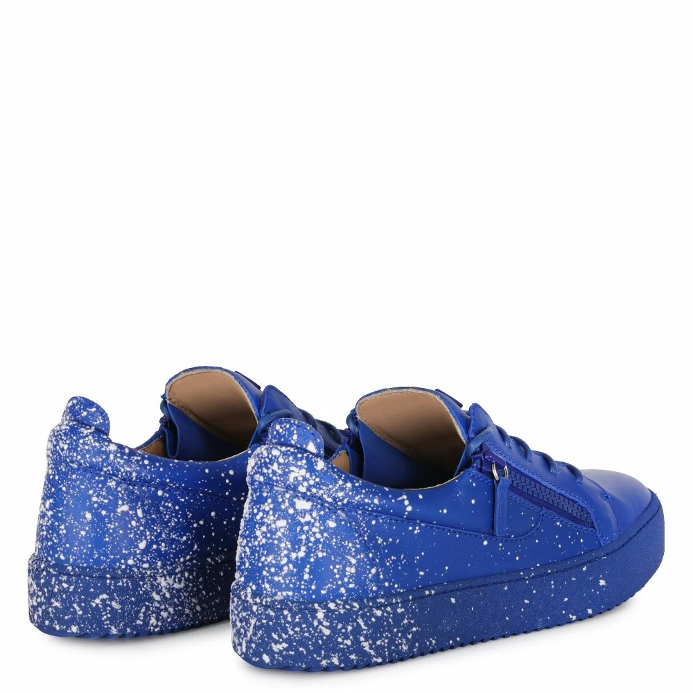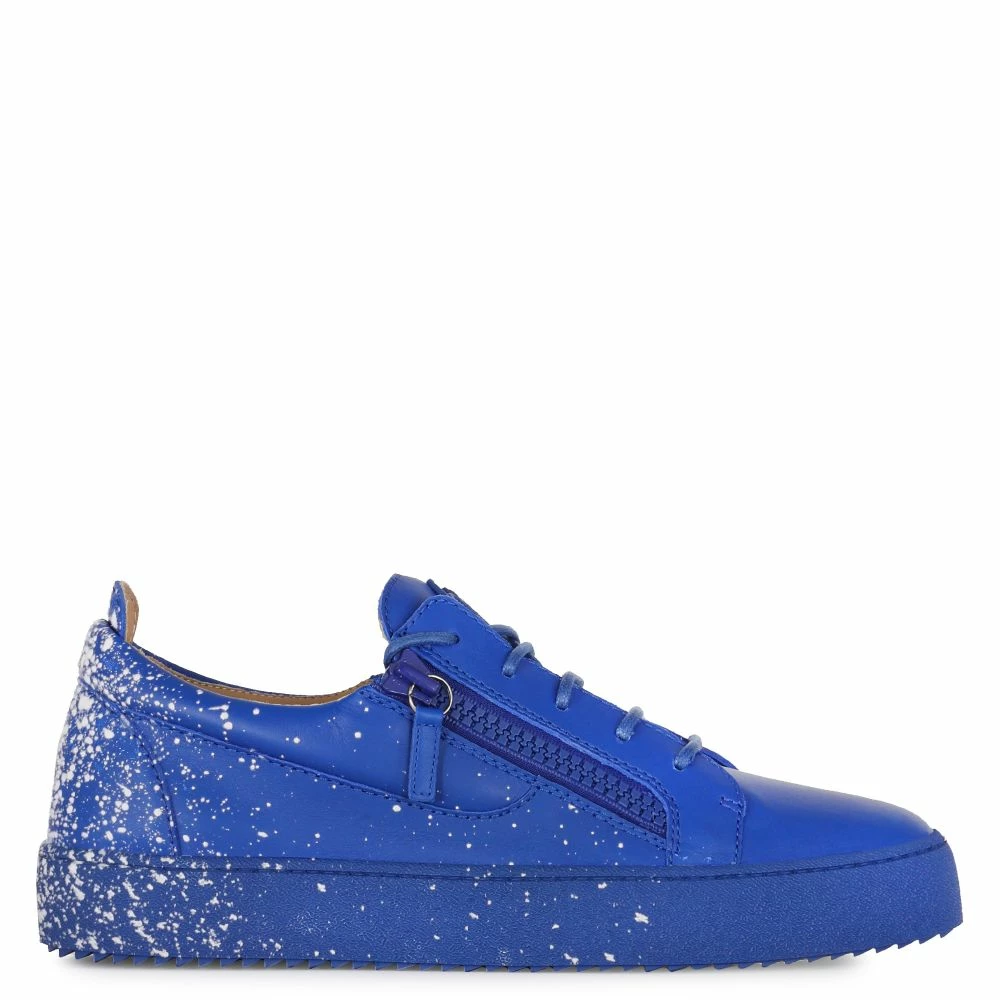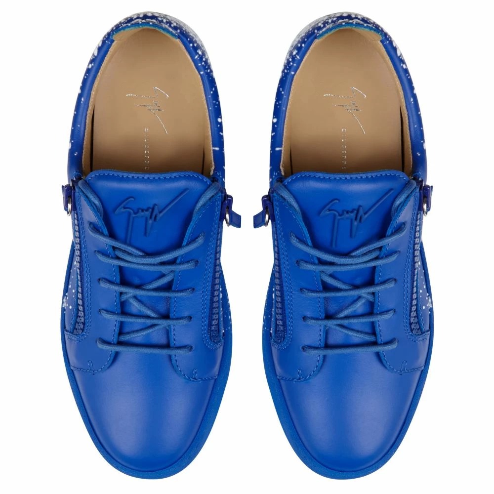 Cornflower-blue leather lace-up sneakers customised with faded white flecking on the heel. Complete with metal brand Signature on the tongue. Rubber sole and side zip fastening.