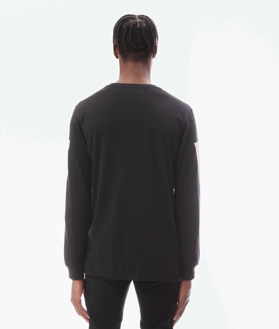 Black long sleeve t-shirt is adorned with a large contrast discharged logo print on the front and also on the sleeves