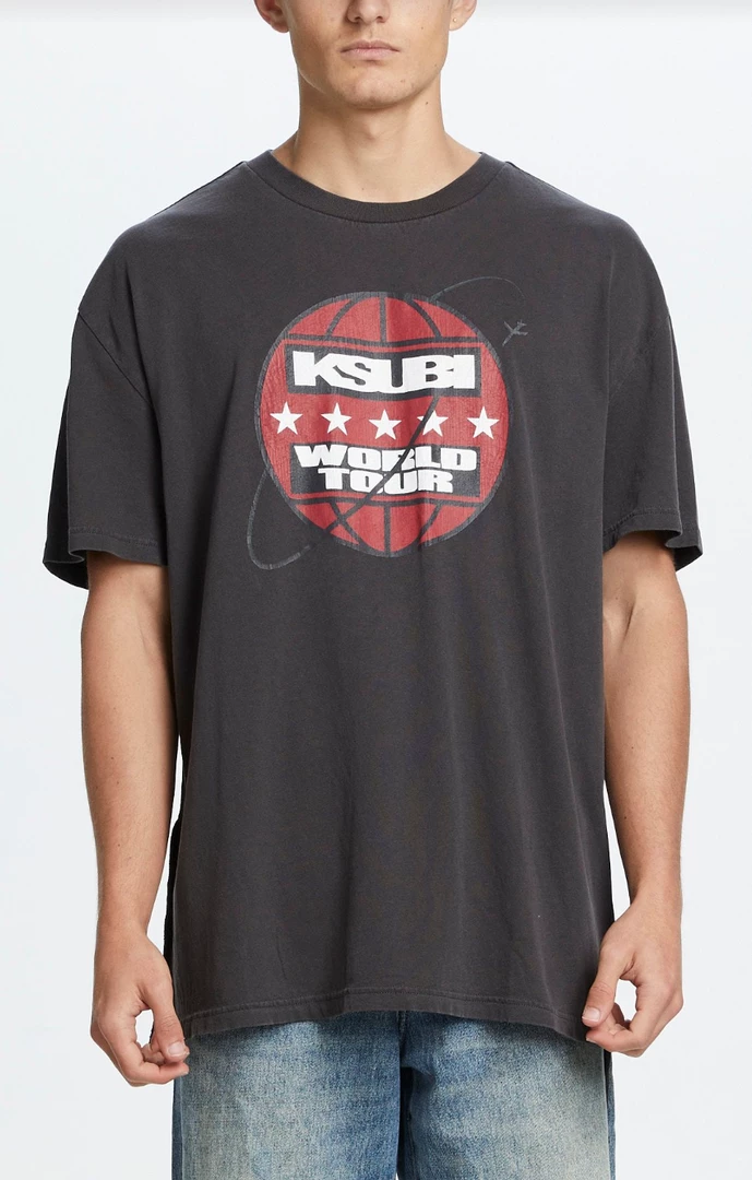 Oversized fit short sleeve t-shirt with raw-cut back hem, reverse overlocked side seam and signature rats tail. Made from a premium cotton jersey in faded black with aged wash. Features screen printed original artwork and a Ksubi t-box print.
