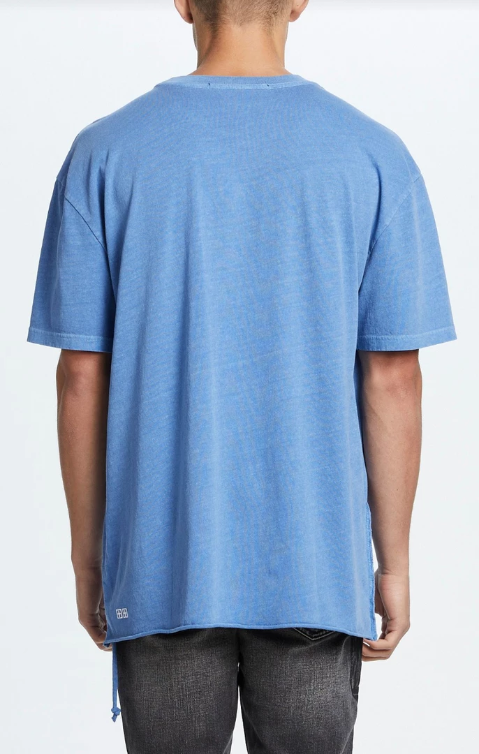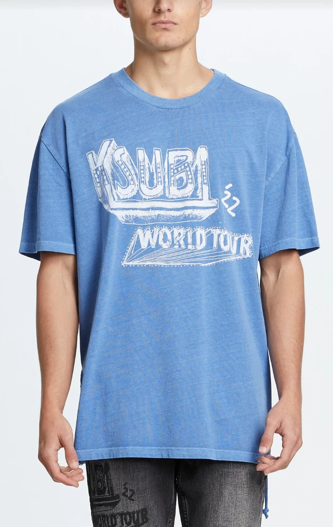 Regular fitted t-shirt with short sleeves and crew neck. It has reverse overlocked side seam detail and signature rats tail. Made from a premium cotton jersey in a muted blue colour with aged wash. Features front and back water based print and Ksubi t-box print. **SAMPLE NOTE** Pictured is the ‘Biggie’ fit, will be ‘Kash’ for bulk production.