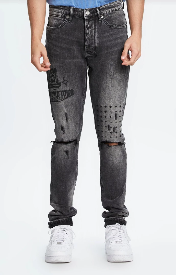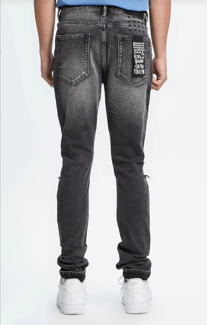 Skinny fit jean with a mid rise with unique angled belt loops and front fly seam. Made from a premium comfort stretch denim in a faded black wash Features front knee deconstruction, smash print, embroidery details, light grinding and ksubi branding.