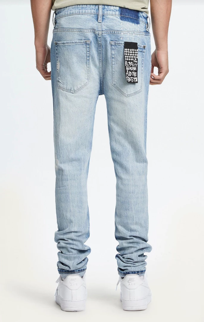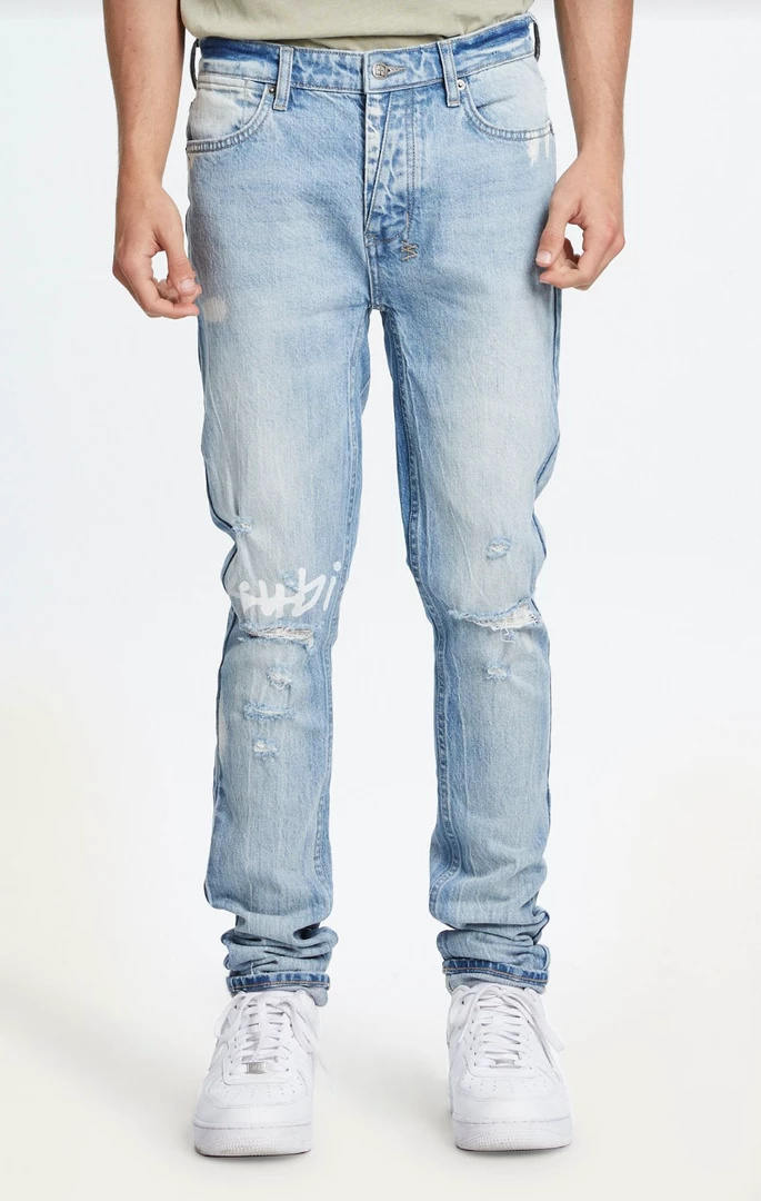 Skinny fit jean with a mid rise with unique angled belt loops and front fly seam. Made from a premium comfort stretch denim in a medium indigo faded wash. Features front knee deconstruction & print details as well as light grinding and ksubi branding.