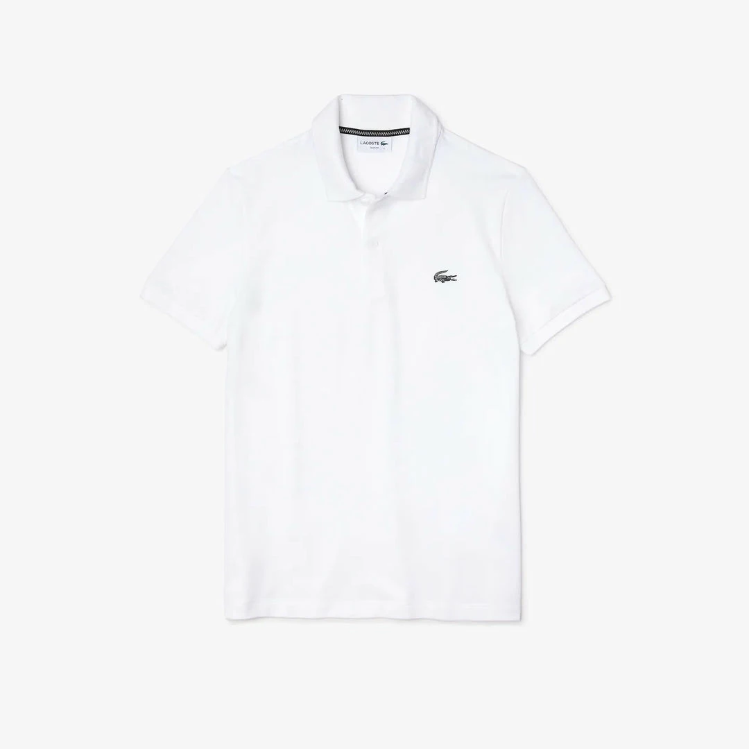 Jacquard Lacoste wording features on the collar of his solid polo shirt. The stretch cotton piqué offers perfect comfort and is embellished with branded rubber touch buttons and ribbed finishings at the sleeve hem. Its on-trend slim fit will quickly become one of your season essentials.