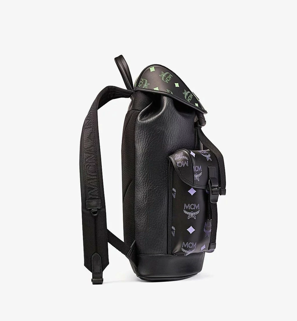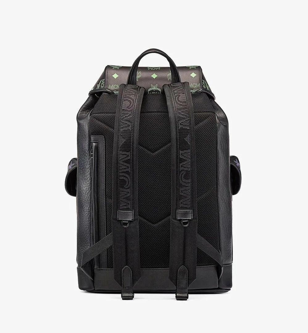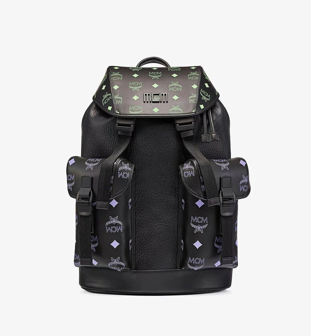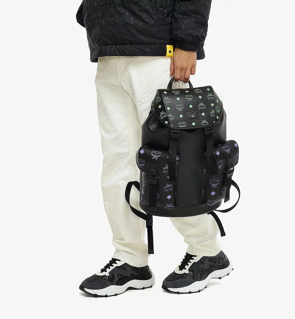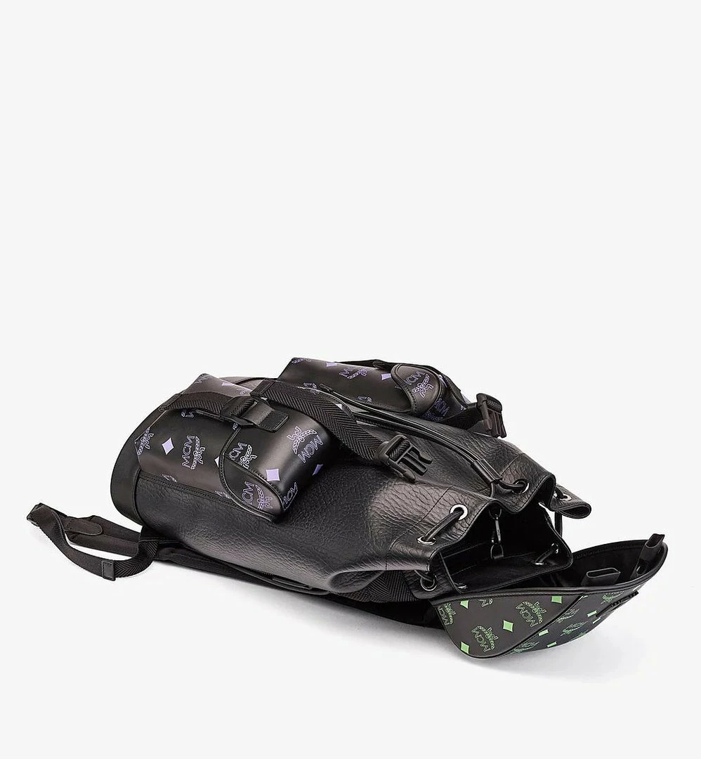 Reminiscent of a colorful night sky, the brilliant constellation of classic codes is printed on the black Italian split leather body of the updated Brandenburg backpack. Now featuring dual front flap pockets for quick storage, the portable icon retains military hallmarks including robust buckle closures and leather drawstring fastening for steadfast security.