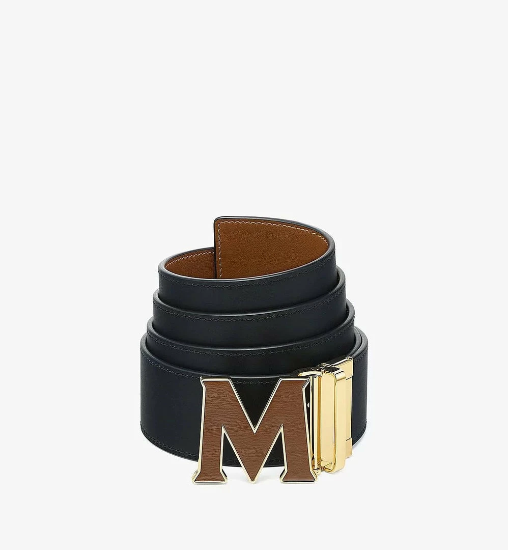 - 24k gold-plated metal “M” buckle with leather inlay