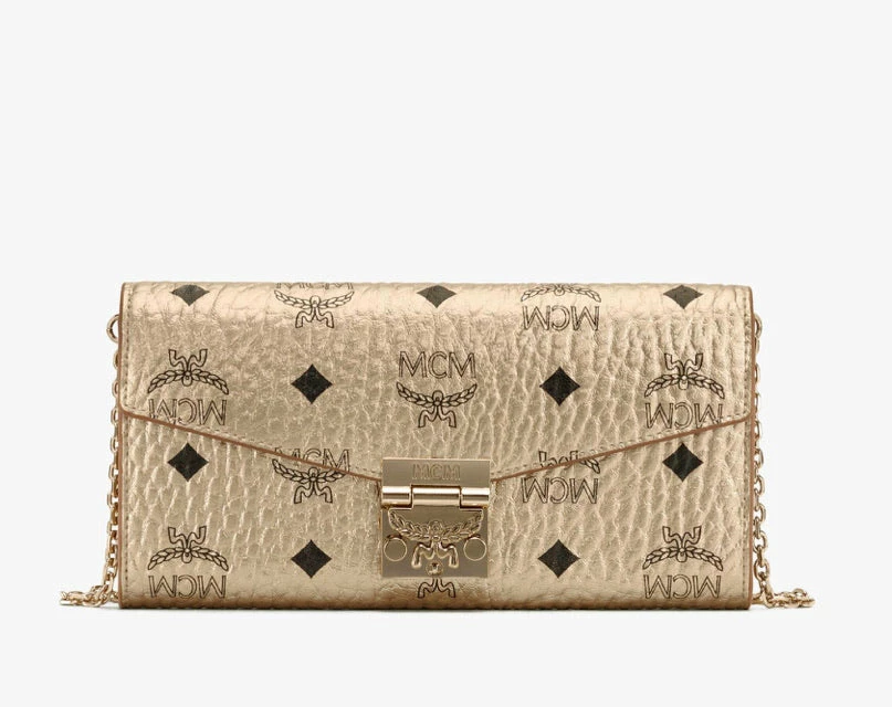 A two-fold wallet fitted with compartments for your cash and cards. An engraved Laurel lock closure ensures everything is secured in style. For handsfree wear, simply attach the chain strap and tuck it inside for later use.