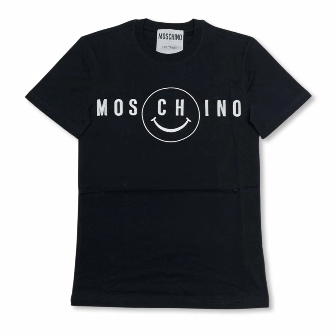 Organic cotton jersey T-shirt with logo and Moschino Smiley® embroidered on the front.