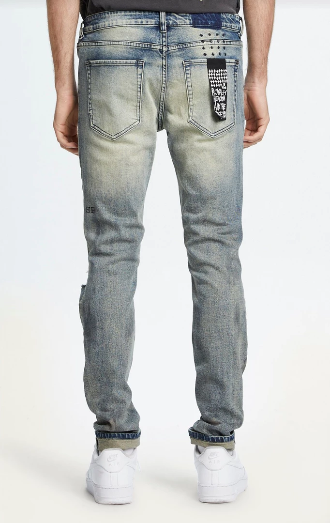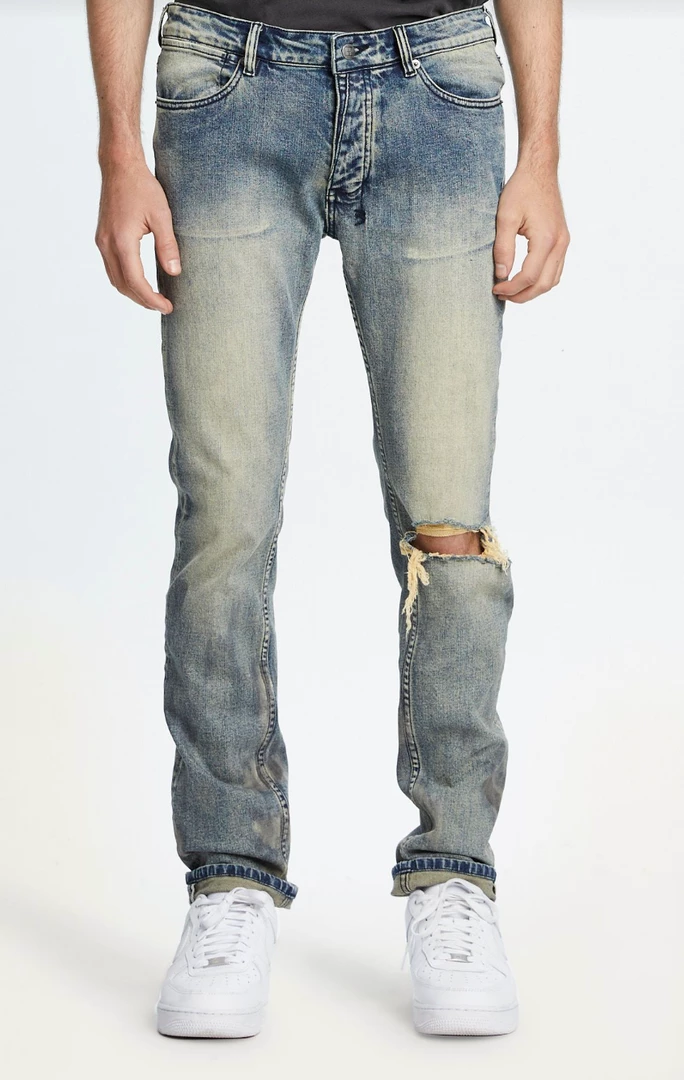 Skinny fit jean with a mid rise with unique angled belt loops and front fly seam. Made from a premium comfort stretch denim in a heavy tinted wash. Features front single knee deconstruction, light grinding and ksubi branding.