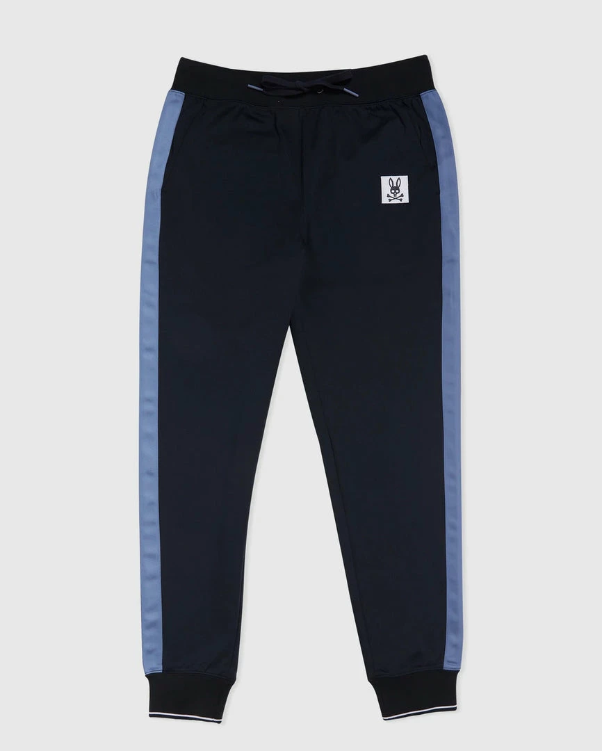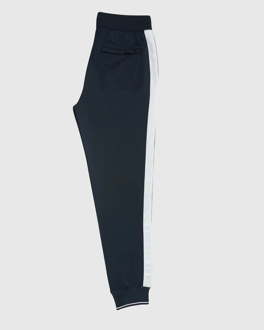 Our mens Daniel track pants serve up sporty, retro vibes, with a sophisticated twist. These track pants are crafted from a cotton-polyester blend that’s as durable as it is comfortable. The Daniel track pants are equipped with rubber-tipped drawstrings at the waist, ribbing at the ankle cuffs, slash pockets at the hips and a zippered pocket at the rear. Bold striped taping down the legs and a jacquard logo patch give these track pants a vibrant touch that’s sure to stand apart.