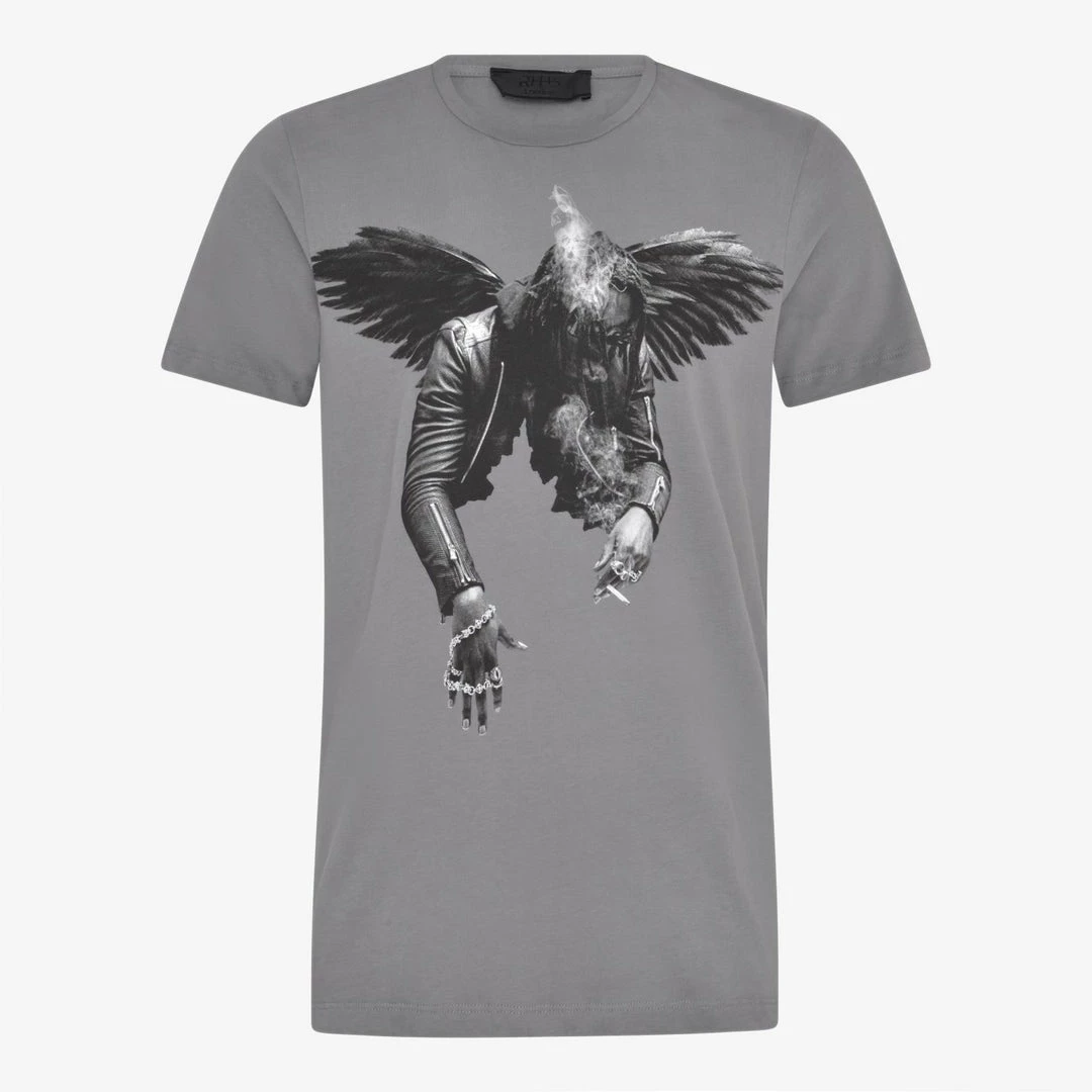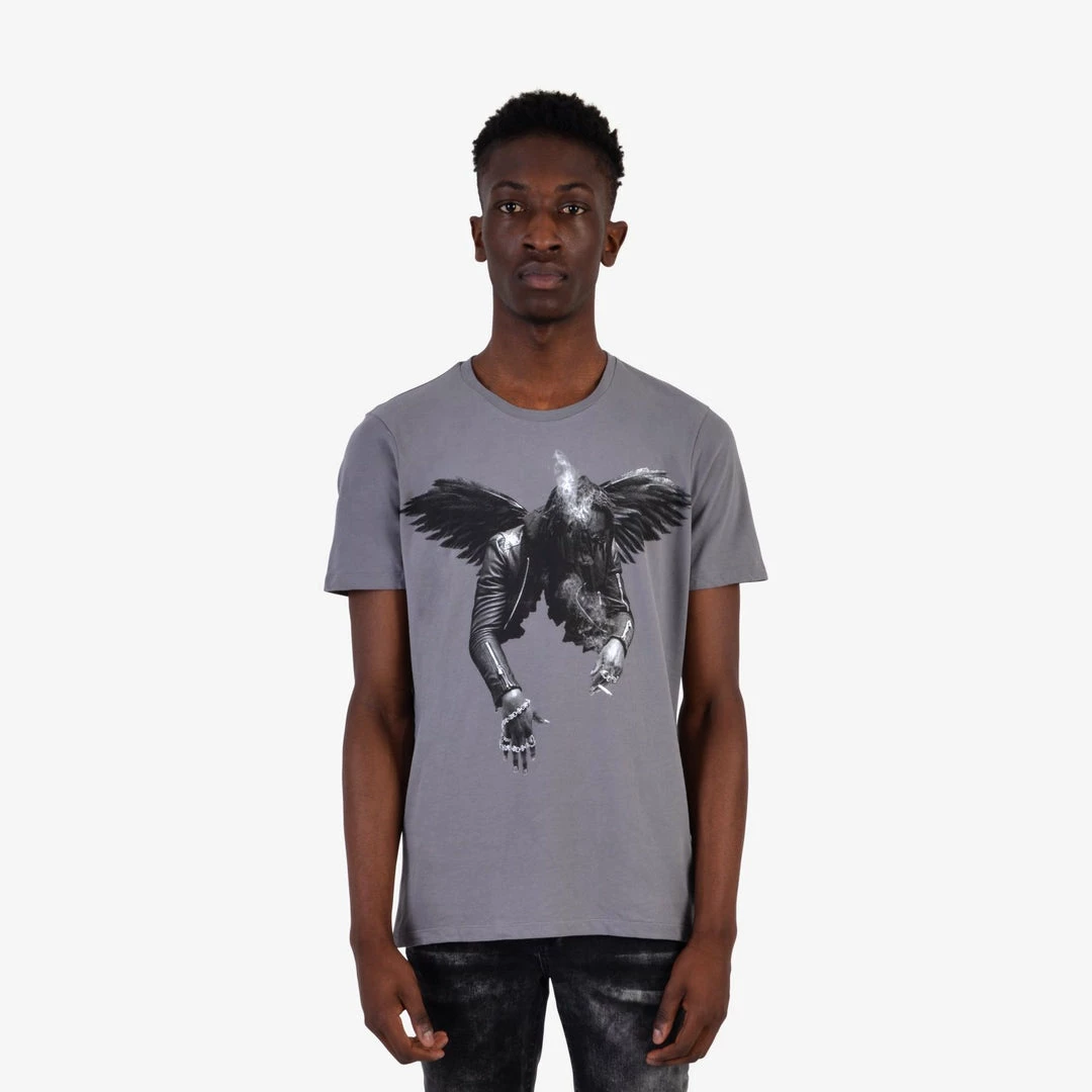 GREY T-SHIRT WITH EXCLUSIVE FALCON PRINT. HAND-EMBELLISHED WITH METAL CHAINS AND CRYSTALS.