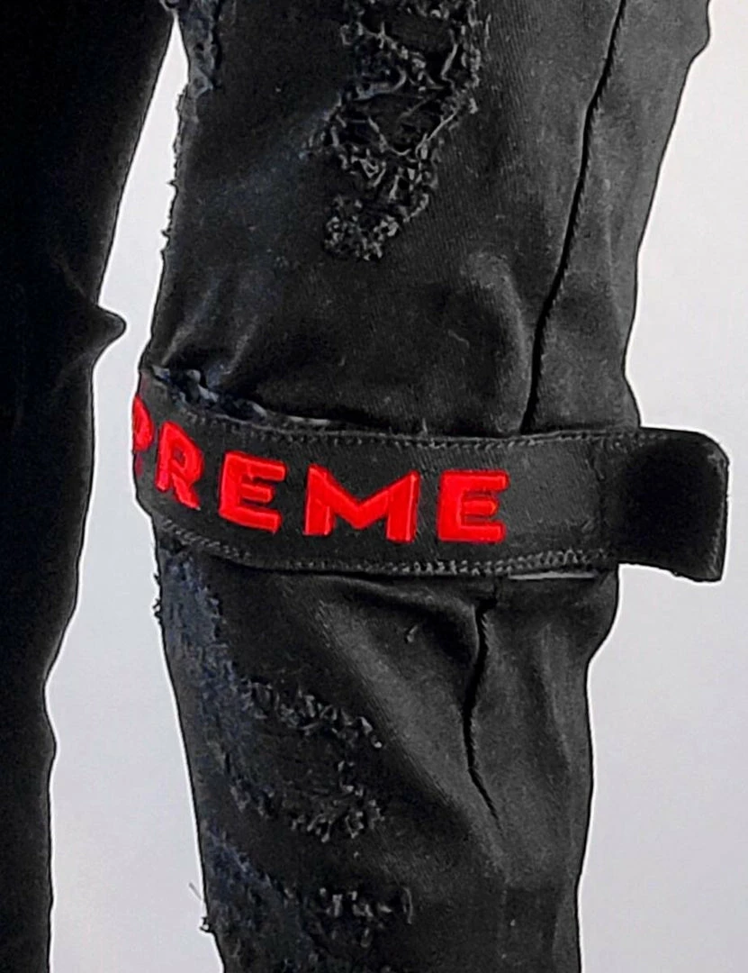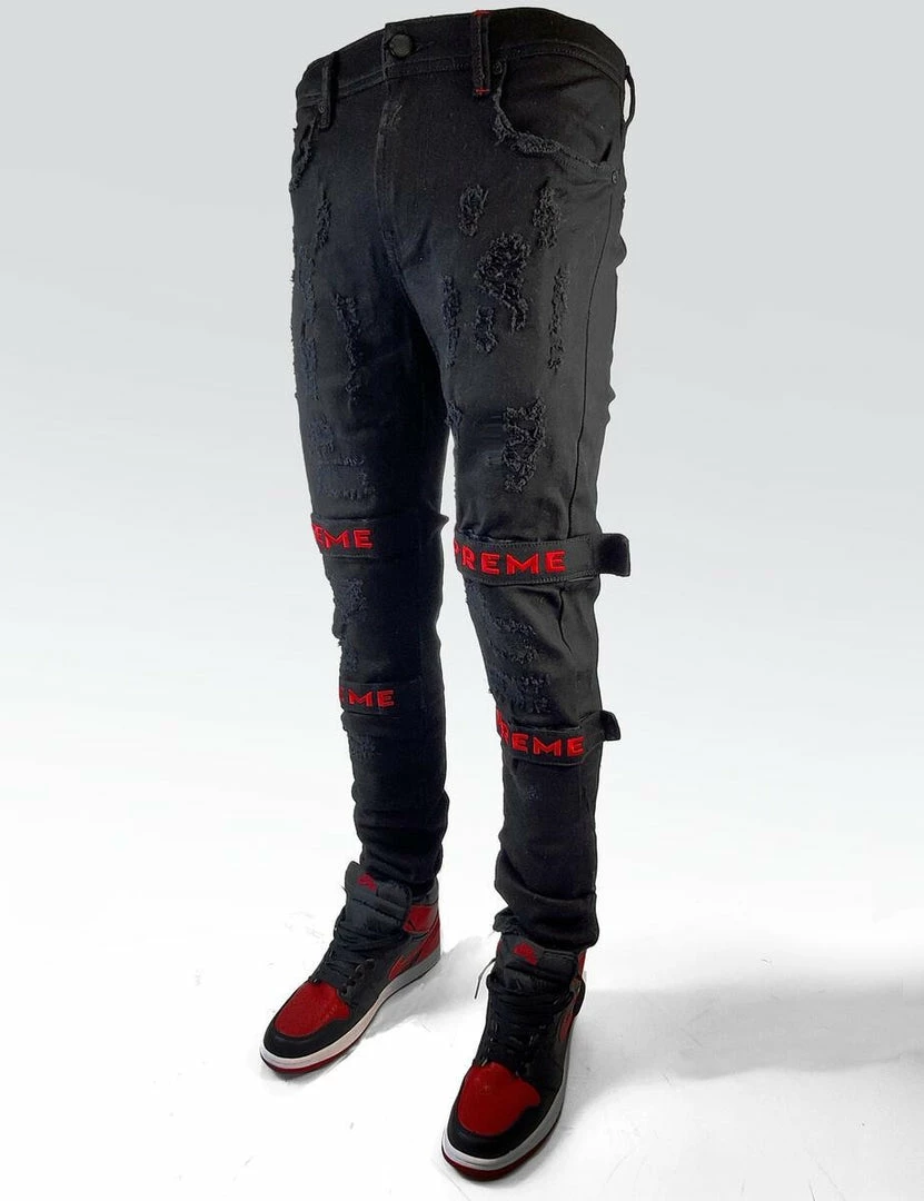 Preme Denim (black/red jeans with bottom tape )
