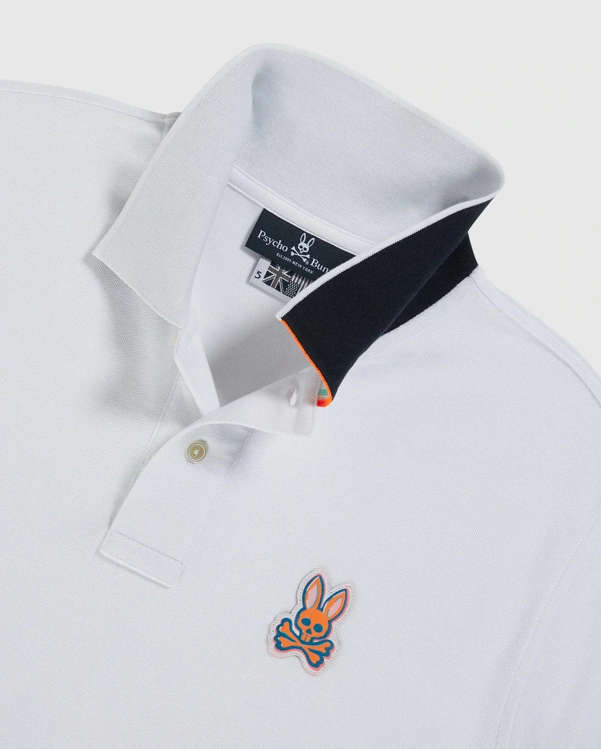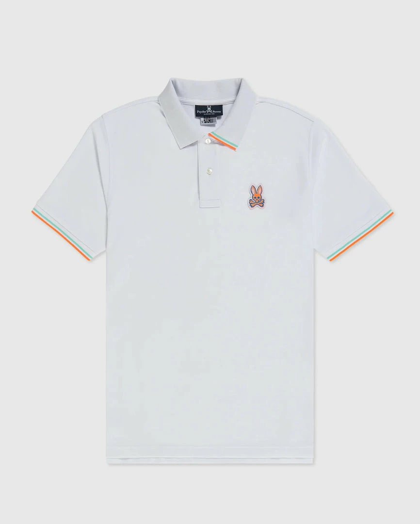 tall Noah polo. This polo is crafted from only the softest Pima cotton, for a luxe on-body feel, and is finished with all of our trusted trimmings: mother-of-pearl buttons, taped seams, side vents and a collar that never rolls. The Noah is cut a touch longer than the average polo, with a trim fit that hits the sweet spot between classic and slim. Taped seams in the shoulders and our unique diamond knit piqué ensure it never loses that perfect fit. The Noah is finished with vibrant tipping on the cuffs and left collar, with a contrast woven undercollar, while a jacquard Psycho Bunny patch is appliquéd on the left chest. The vibrant, unexpected detailing is sure to stand apart every time you pull this polo on.