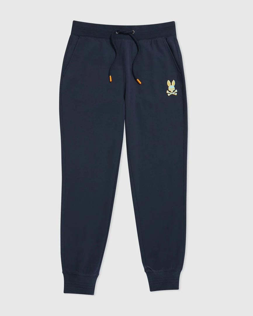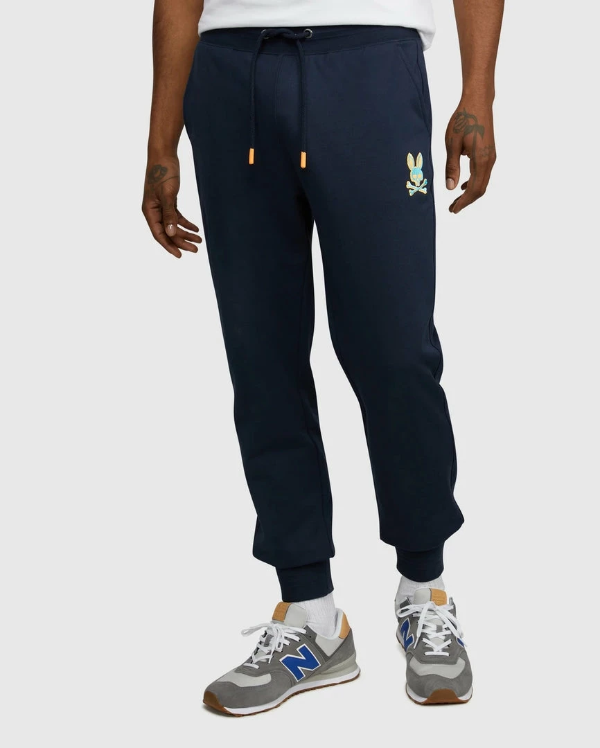 Kick back in comfort and style with our mens Bennett sweat pants. These sweats are crafted from only the softest French terry cotton for a peerless on-body feel. The Bennett sweat pants feature two slash pockets on the hips, a zippered pocket at the rear, rubber-tipped drawstrings at the waist, and ribbing at the ankle cuffs. A vibrant two-tone Psycho Bunny logo is embroidered on the left thigh.