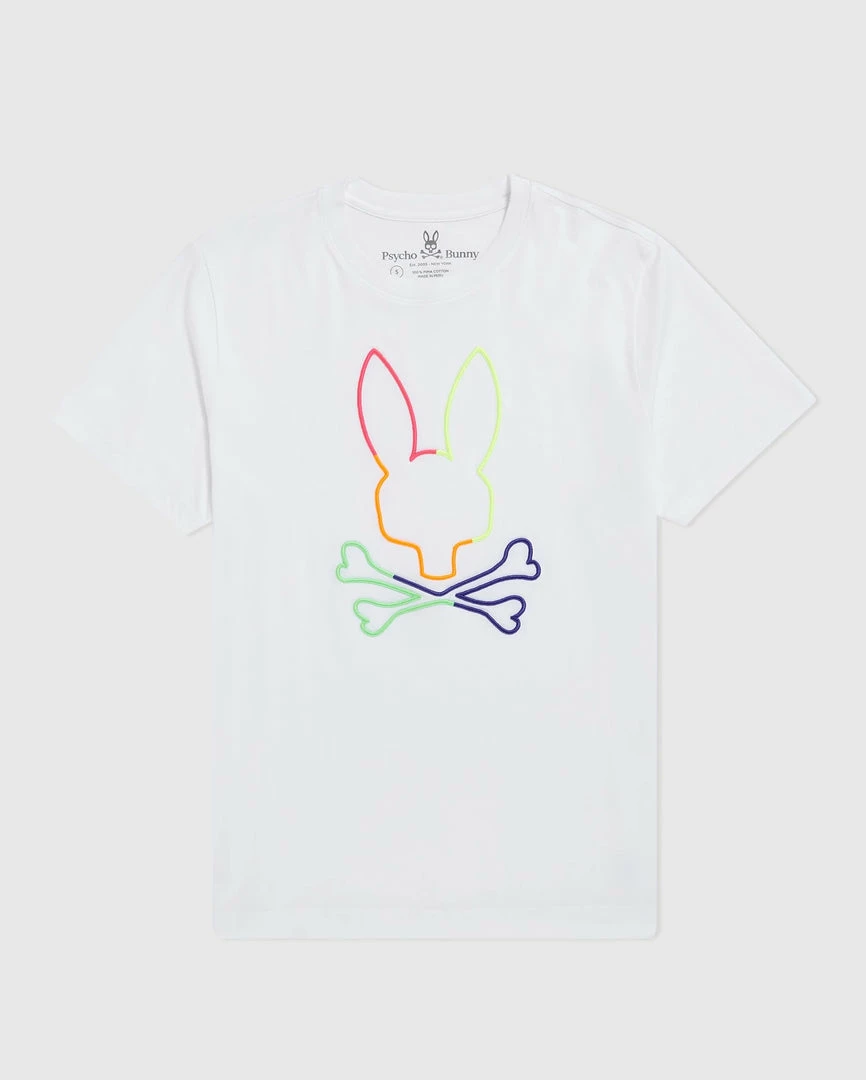 Give your layering game added character with the mens Leo Bunny tee. Crafted to lofty standards using only the softest Pima cotton, this tee is cut a little bit longer than the average T-shirt with a trim fit that hits the sweet spot between classic and slim. Taped seams in the shoulders provide comfort, while ensuring the Leo never loses its perfect fit. The Leo is finished with a raised Bunny outline embroidery, rendered in vibrant neon hues that stand apart whether worn as a statement tee or layered under a zip-up hoodie.