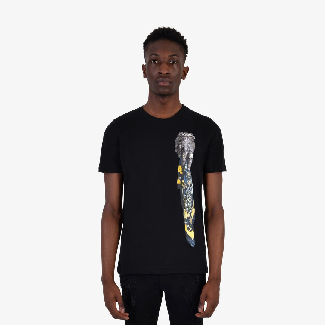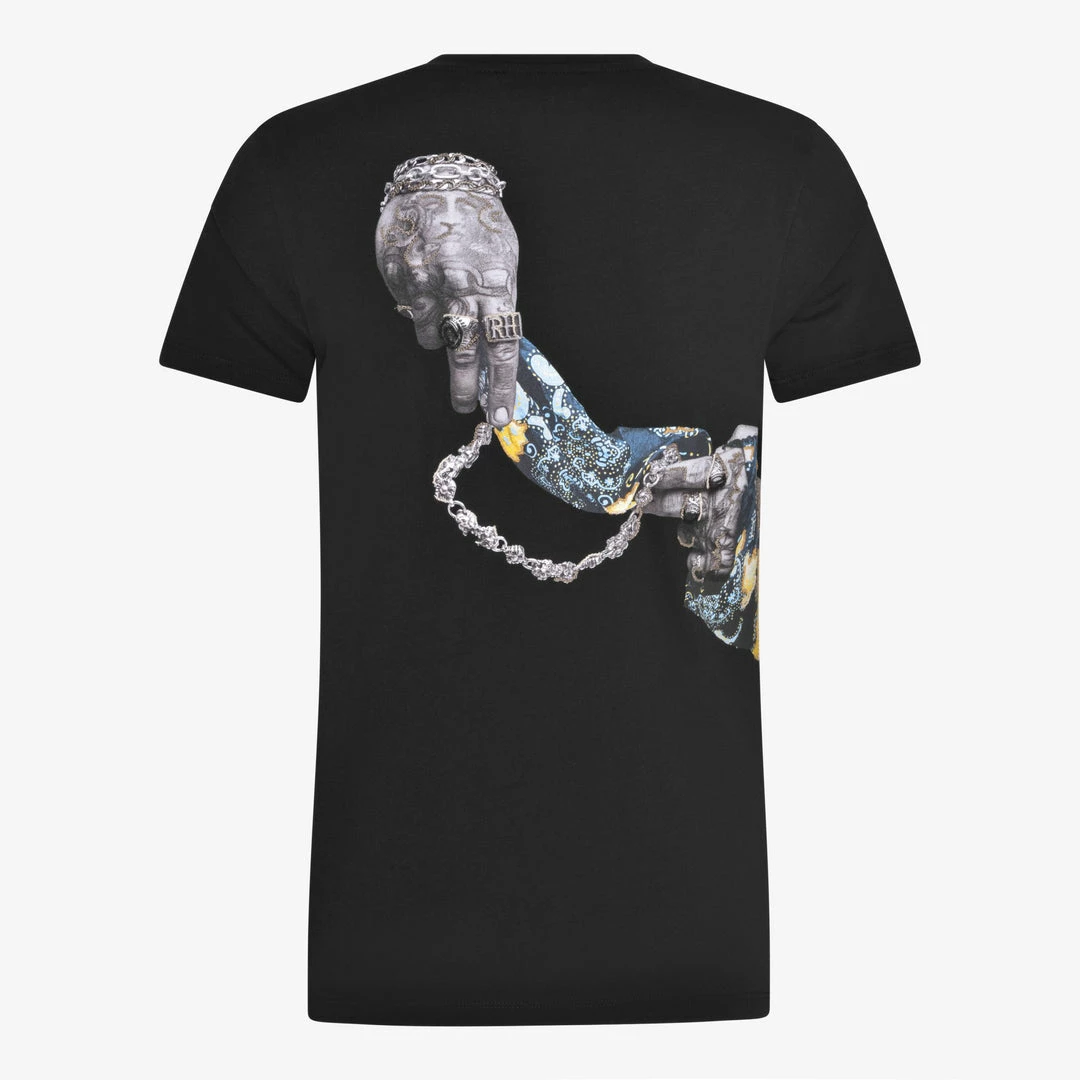 BLACK T-SHIRT WITH EXCLUSIVE SAXON PRINT. HAND-EMBELLISHED WITH METAL CHAINS.