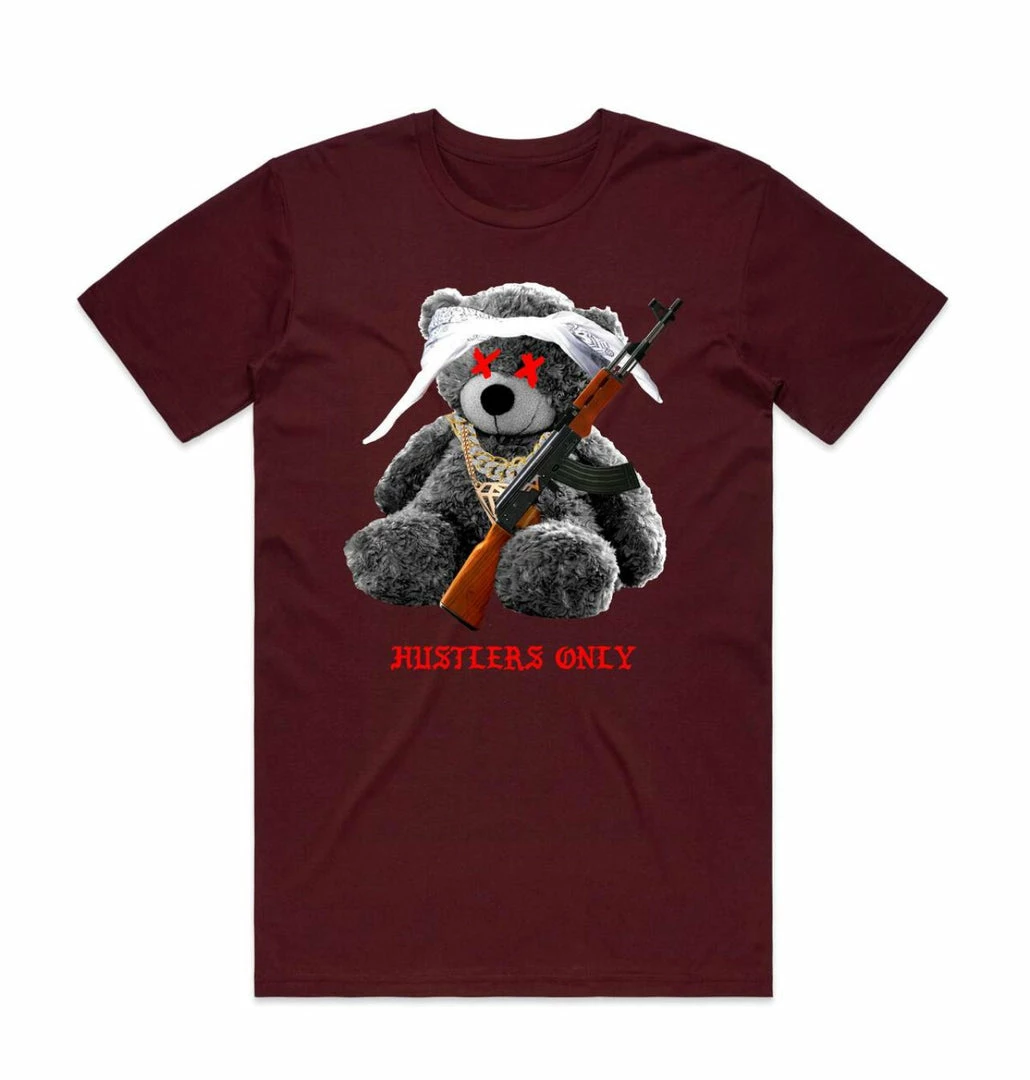 Streetwear (burgundy “hustlers Only Teddy Bear T-shirt) New Arrivals