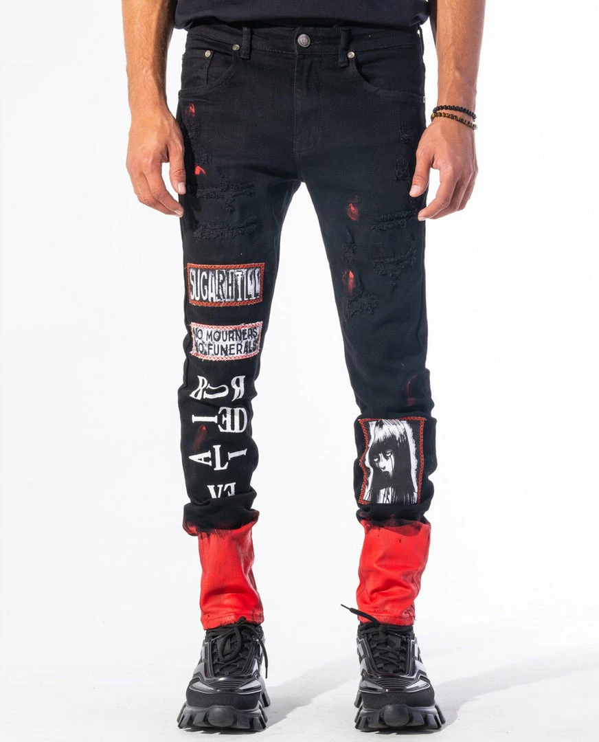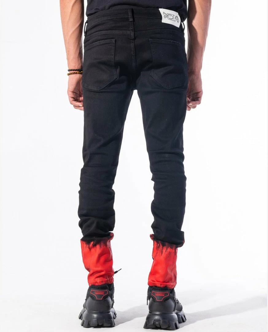 – BLACK WASH STRETCH TAPERED DISTRESSED DENIM WITH PAINTED RED AT THE BOTTOM