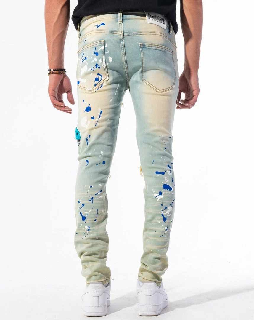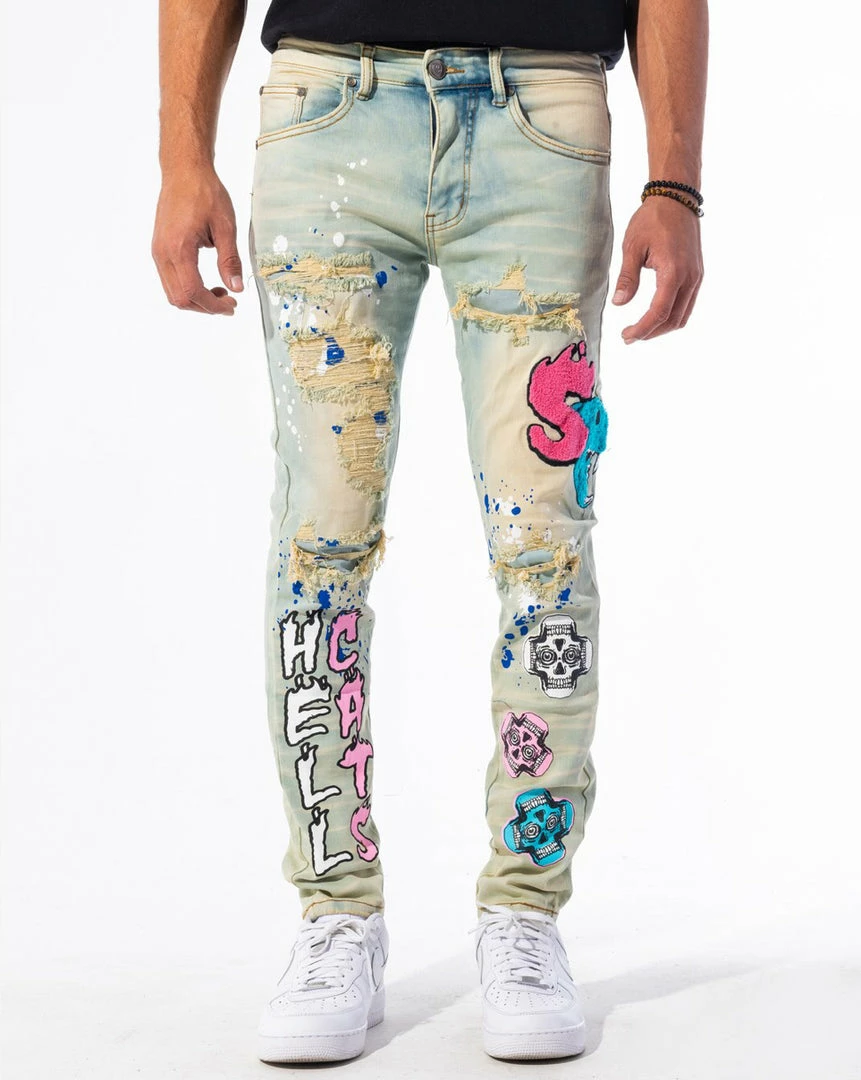 – LIGHT WASH STRETCH TAPERED DENIM WITH DISTRESSING THAT’S BACKED