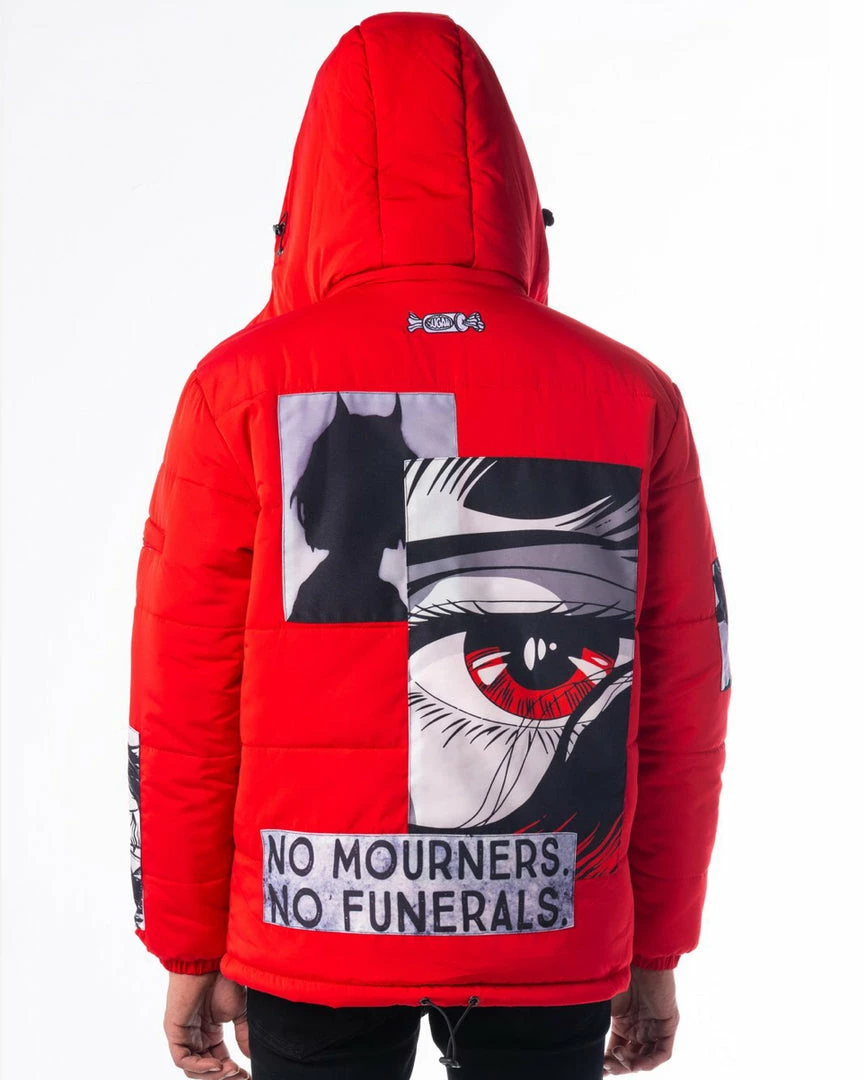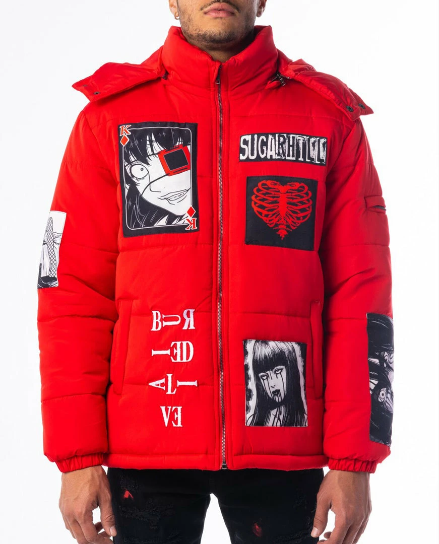 – Multi Canvas Graphic Patches throughout the zip-up puffer jacket